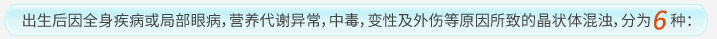 又叫發(fā)育性白內(nèi)障,多在出生前后即已存在,多為靜止型,可伴有遺傳性疾病,有內(nèi)生性與外生性兩類,內(nèi)生性者與胎兒發(fā)育障礙有關(guān),外生性者是母體或胎兒的全身病變對晶狀體造成損害所致。