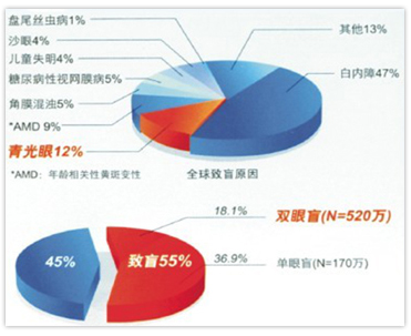 青光眼的主要危害是損害視神經(jīng),使患者出現(xiàn)視力下降、視野缺損,患者視線范圍內(nèi)出現(xiàn)盲區(qū),隨著病情的進(jìn)展,黑點范圍不斷擴(kuò)大,最終導(dǎo)致失明。青光眼是全球第2位致盲眼病,僅次于白內(nèi)障。一項國內(nèi)調(diào)查顯示,我國青光眼患者55%致盲,18.1%導(dǎo)致雙眼盲。