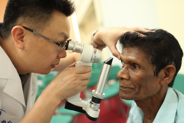 張廣斌在“湄公河光明行”中為患者進行眼部檢查
