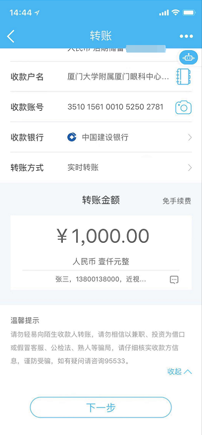 通過對公賬戶繳費的患者需要標注姓名+電話+近視手術(shù)開放日。