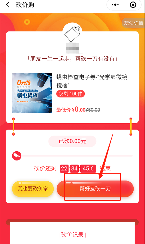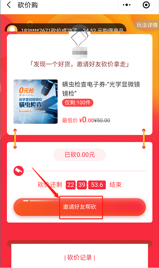 2、邀請(qǐng)10人助力砍價(jià),可0元購(gòu)螨蟲(chóng)鏡檢