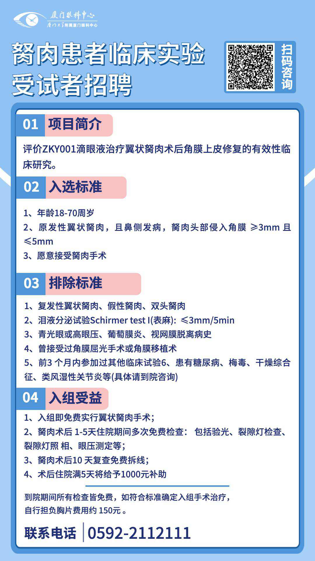 本次研究對受試者的個(gè)人信息將嚴(yán)格保密,所獲的所有信息將僅作研究分析之用。如果有可能符合以上條件或想了解更多信息的朋友,可以通過以下方式咨詢:0592-2112111