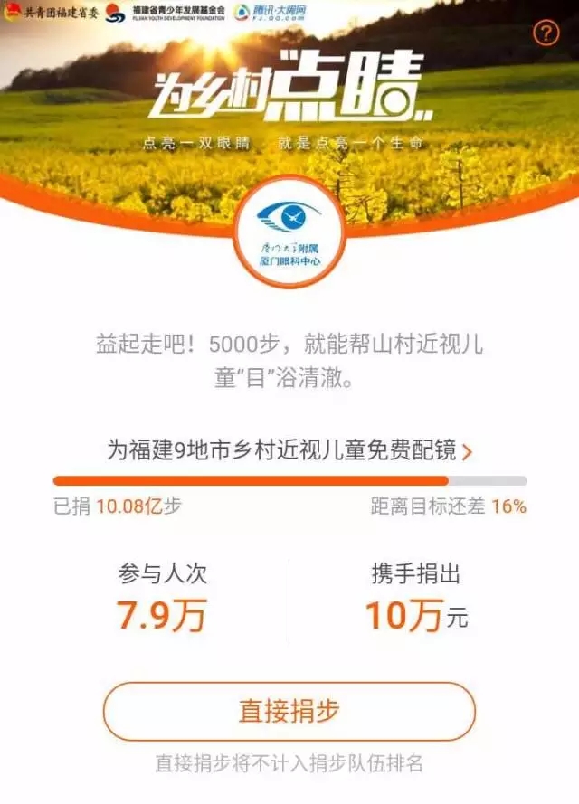 全民暴走,以5000步為起捐門檻,網(wǎng)友捐出的每一次5000步,廈門大學(xué)附屬廈門眼科中心都將捐出相應(yīng)的配捐資金。目前,已為福建9地市鄉(xiāng)村近視兒童配鏡累計(jì)捐出10億步,為近視兒童捐出10萬元。