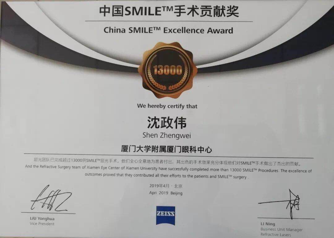 此次會(huì)議授予了沈政偉院長(zhǎng)“中國(guó)SMILE™手術(shù)貢獻(xiàn)獎(jiǎng)”。此獎(jiǎng)項(xiàng)代表著對(duì)沈政偉院長(zhǎng)的信任與肯定以及對(duì)廈門眼科中心的認(rèn)可,也代表著沈政偉院長(zhǎng)在屈光手術(shù)方面的成就與榮譽(yù)。