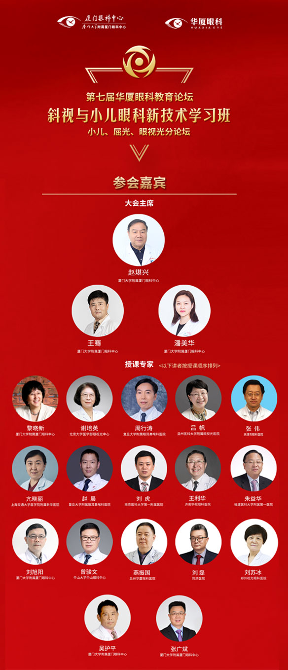 巔峰聚首,百家爭鳴!10月18日-21日,由廈門大學附屬廈門眼科中心主辦的“斜視與小兒眼科新技術學習班暨第七屆華廈眼科教育論壇小兒、屈光、眼視光分論壇”云端際會,精彩盛放。本屆論壇由47名大咖學者領銜主講,匯集國內(nèi)眼科領域金字塔尖專家,為我們帶來智慧激蕩的高峰論劍。大會主席:國際眼科科學院院士、華廈