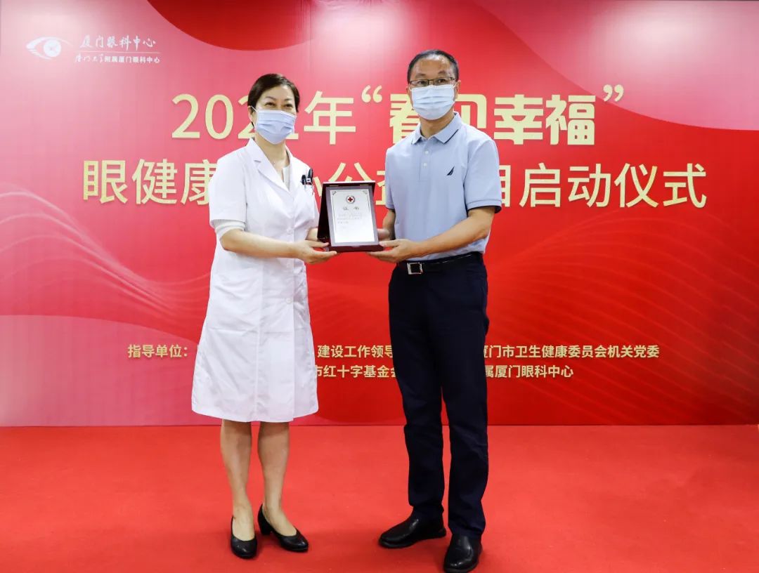 啟動(dòng)儀式上,廈門(mén)市紅十字會(huì)代表授予廈門(mén)大學(xué)附屬?gòu)B門(mén)眼科中心“中國(guó)紅十字奉獻(xiàn)獎(jiǎng)?wù)?rdquo;及“福建省紅十字人道金質(zhì)獎(jiǎng)?wù)?rdquo;。其中,“中國(guó)紅十字奉獻(xiàn)獎(jiǎng)?wù)?rdquo;是中國(guó)人道公益事業(yè)的榮譽(yù)之一,用以表彰醫(yī)院對(duì)紅十字人道公益事業(yè)作出的重大貢獻(xiàn)。據(jù)了解,廈門(mén)大學(xué)附屬?gòu)B門(mén)眼科中心與廈門(mén)市紅十字會(huì)已攜手多年開(kāi)展多項(xiàng)愛(ài)心眼健康公益行動(dòng),深受廣大人民群眾認(rèn)可。