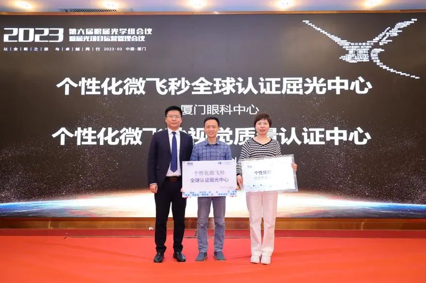 ▲ 蔡司醫(yī)療屈光大東區(qū)患教經(jīng)理吳婷婷女士、蔡司醫(yī)療福建區(qū)域銷售經(jīng)理顏斐嶸先生為廈門(mén)眼科中心頒發(fā)“全飛秒科普貢獻(xiàn)獎(jiǎng)”。