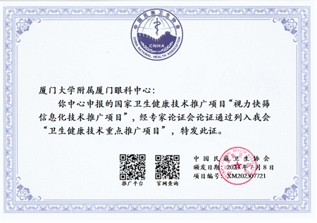 11月25日,在廈門(mén)市醫(yī)院協(xié)會(huì)第三屆年會(huì)暨“學(xué)科引領(lǐng)高質(zhì)量發(fā)展”學(xué)術(shù)會(huì)議上,廈門(mén)大學(xué)附屬?gòu)B門(mén)眼科中心“視力快篩信息化系統(tǒng)”榮獲廈門(mén)市醫(yī)院協(xié)會(huì)第三屆“年度醫(yī)療十大創(chuàng)新技術(shù)”項(xiàng)目,同時(shí)“視力快篩信息化技術(shù)推廣項(xiàng)目”經(jīng)國(guó)家衛(wèi)生健康技術(shù)應(yīng)用推廣項(xiàng)目專家論證會(huì)論證,成功入選中國(guó)民族衛(wèi)生協(xié)會(huì)2023年度“衛(wèi)生健康技術(shù)重點(diǎn)推廣項(xiàng)目”。